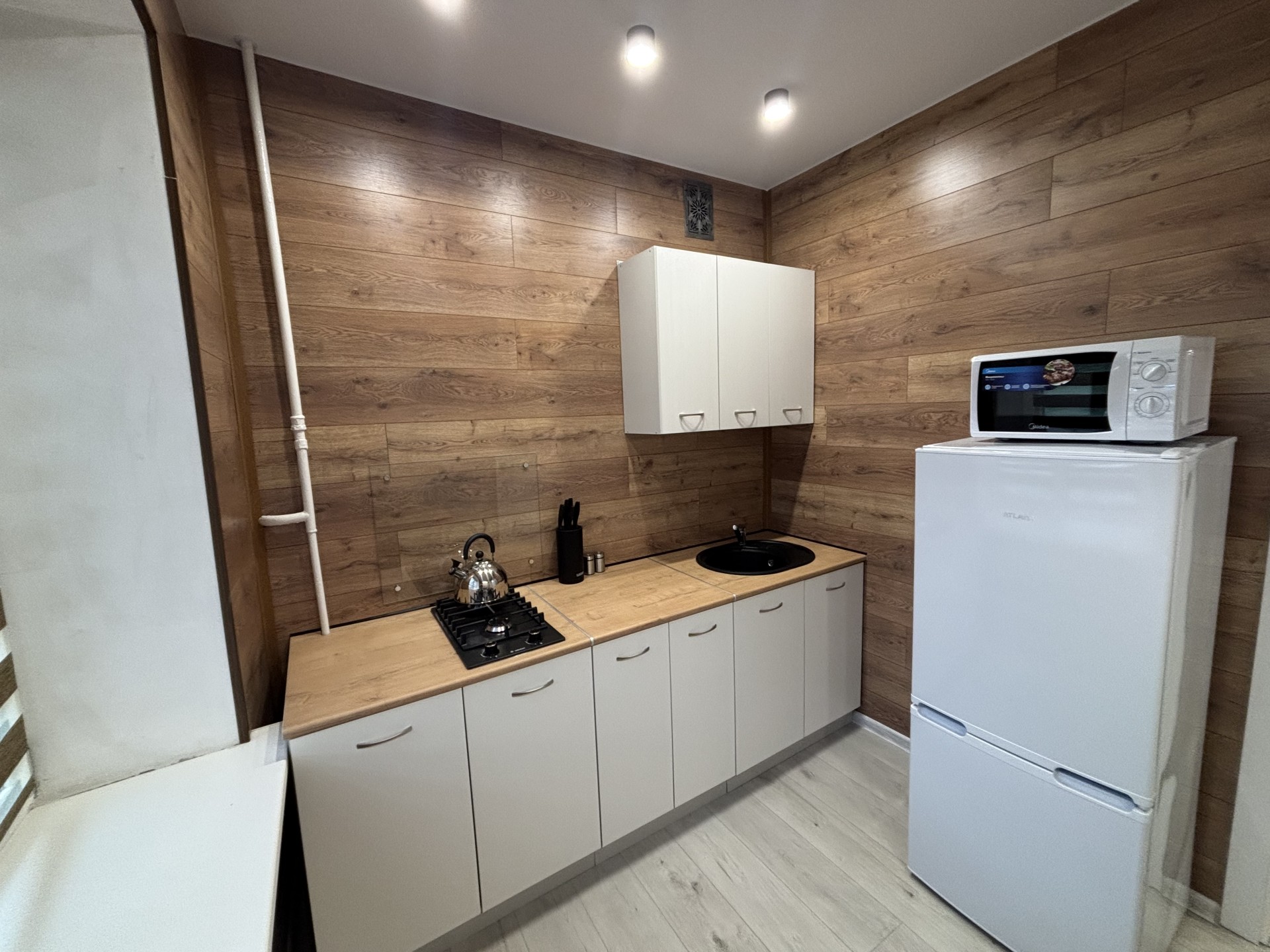 Cовременная кухня с плитой, холодильником, СВЧ печью, чайником и всей необходимой посудой и кухонной утварью, чай, кофе, сахар, соль.